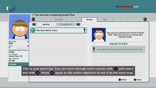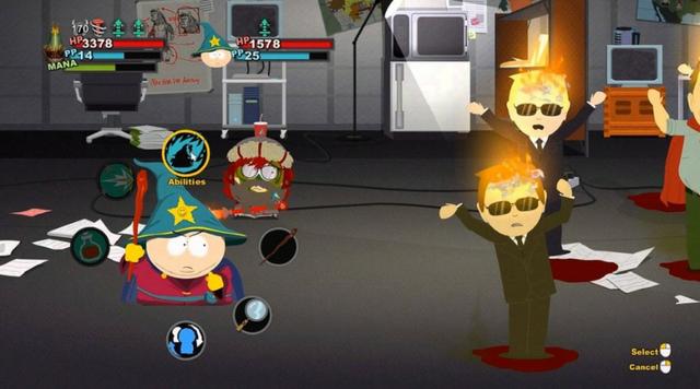 Agora fora das batalhas também vamos poder usar muitas outras habilidades. Muitas vezes até podemos manipular os cenários de forma a criar algumas armadilhas para derrotar os nossos oponentes sem entrarmos em combate, ganhando na mesma os pontos de experiência. Vamos tendo também várias sidequests para cumprir e podemos inclusivamente customizar o equipamento que encontrando com alguns patches que lhe conferem novas habilidades. Portanto, como um RPG, este South Park é algo simples na sua estrutura, principalmente na customização da nossa personagem. No entanto possui muita variedade na sua jogabilidade, incluindo inclusivamente alguns mini-jogos que por vezes teremos de jogar, mantendo a jogabilidade algo refrescante. Habilidades como o fast travel para vários pontos de South Park são também adições benvindas, embora a cidade não seja tão grande quanto isso.