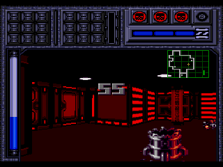 Este é um FPS relativamente simples, os cenários são todos labirínticos, repletos de corredores estreitos e serpenteantes. O objectivo em cada nível é o de procurar o núcleo, destruí-lo e voltar ao ponto de partida, pois a partir do momento em que destruímos o núcleo, é activada uma sequência de auto destruição que destrói todo o andar onde estamos. Não temos desníveis, e todas as superfícies fazem um ângulo de 90º entre si. É então um clone de Wolfenstein 3D, portanto, mas com uma série de particularidades. A primeira é que não vemos a arma que equipamos no ecrã, mas não há problema, certamente a Domark conseguiu ganhar mais uns frames assim. Depois ao olhar para toda a interface gráfica é que nos vamos apercebendo de todas as particularidades deste Bloodshot.