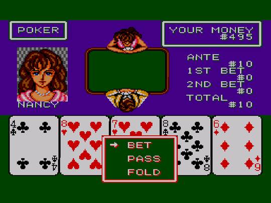 No que diz respeito aos audiovisuais, confesso que este Casino Games foi uma agradável surpresa. Os gráficos são coloridos e bem detalhados, dentro dos possíveis, claro, visto que estamos a jogar cartas ou pouco mais. Mas no caso do Poker, podemos escolher diferentes oponentes que por sua vez vão tendo diferentes expressões faciais consoante a maneira em como o jogo está a correr. Para além disso, temos aqui uma das melhores sequências de Game Over de sempre! As músicas são também agradáveis, sendo este um dos jogos que suporta o FM Sound, algo que só está disponível nativamente nas Master System e Mark III japonesas, se bem que este jogo nunca saiu no Japão. Mas visto ter saído em 1989, ano do último lançamento para a Master System em solo nipónico, talvez a certa altura do seu desenvolvimento estivesse previsto um lançamento japonês.