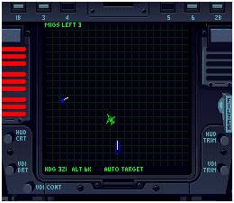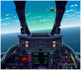 Ora sendo este um simulador e não um jogo arcade como After Burner, não temos um reservatório quase ilimitado de mísseis, bem pelo contrário, o seu número é bastante limitado, embora vamos tendo diferentes tipos de misseis para usar. Apenas em missões mais avançadas é que teremos a possibilidade de regressar à base uma ou duas vezes para reabastecer combustível e rearmar (isso é indicado no briefing inicial de cada missão). Para além disso também teremos de ter em conta o combustível que estamos a usar, sendo que aqui, temos sempre direito a um reabastecimento aéreo em cada missão, surgindo um avião no mapa para o efeito, sempre que os nossos níveis de combustível estejam baixos. Portanto, entre reabastecimento de combustível no ar e uma eventual paregem na base, temos de ter sempre em conta o combustível e poupar nos mísseis sempre que possível. Ou seja, muitos dos aviões que vamos abater têm de ser combatidos em verdadeiros dog fights, com recurso à metralhadora. Ah, e a partir de certas alturas convém evitar voar perto de submarinos inimigos (também marcados no radar), pois muitas vezes disparam mísseis contra nós, obrigando-nos a tomar manobras evasivas e activar os flares.