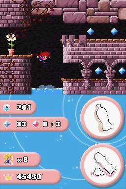 Depois, para substituir as moedas, temos imensos diamantes azuis para coleccionar, onde a cada 100 ganhamos uma vida extra. Existem memo muitos diamantes destes espalhados ao longo dos 80 níveis do modo de jogo principal, pelo que também não é muito difícil amealhar vidas extra. Para além dos diamantes azuis teremos também um número variável de diamantes vermelhos para apanhar em cada nível. Se os conseguirmos apanhar todos, teremos direito a um nível bónus em cada mundo. Para além disso, após chegar ao final do jogo, podemos também desbloquear uma série de níveis extra, esses sim, um remake do original de 1987.