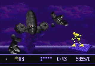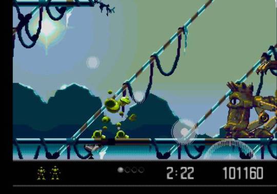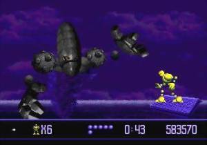 Este é então mais um jogo de acção/plataformas, onde Vectorman pode saltar e disparar a sua arma. O seu corpo é estranho, com os membros todos desconexos do seu tronco, um pouco como o Rayman, mas que lhe dá a habilidade de se transformar noutras formas, algo que teremos de fazer (através de power ups) para atravessar certas zonas dos níveis. Podemos perfurar superfícies, flutuar ou mesmo mudar para uma forma de peixe, útil nos níveis subaquáticos. Outros power ups que podemos encontrar podem ser upgrades da nossa arma, itens que regeneram (ou expandem) a nossa barra de vida, vidas extra, ou simplesmente coleccionáveis para dar mais pontos. Para além dos níveis “normais” de um jogo de acção/plataformas 2D, também vamos tendo ocasionalmente alguns níveis onde jogamos numa perspectiva vista de cima, o que acontece logo no segundo nível, onde Vectorman se transforma um comboio que viaja numa linha de ferro aérea, com um robot gigante a atacar-nos por baixo. Temos mais um ou outro nível com essa perspectiva, todos eles distintos entre si.
