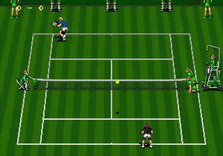 Aqui podemos participar em partidas individuais, que podem ser jogadas contra o CPU, contra ou com um amigo, no caso de optarmos pelos doubles, onde temos 2 tenistas contra 2. Também temos um modo torneio, onde iremos participar no torneio de Wimbledon, mas já lá vamos. A jogabilidade é relativamente simples, com os 3 botões faciais da Mega Drive a serem usados para realizar diferentes raquetadas: altas ou baixas, rápidas ou lentas. Tipicamente os jogos de ténis das eras 8 e 16bit são simples de aprender e este não é excepção. A única coisa que eu não gostei muito na jogabilidade é o facto de por vezes ser difícil adivinhar a que altura vai realmente a bola, o que nos pode induzir em erro e não conseguir dar seguimento a uma jogada.