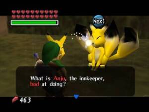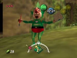 A nível de mecânicas de jogo em si, este Majora’s Mask herda o mesmo tipo de controlos do seu predecessor, com os botões faciais a ficarem associados à utilização de diversos itens que podemos assignar a partir do inventário. O sistema Z-Targetting, está novamente aqui presente, que nos permite fazer lock-on a um inimigo específico, com a câmara a posicionar-se sempre na direcção do inimigo trancado. A grande diferença está mesmo nas mecânicas de controlo do tempo, com o jogo a colocar-nos pressão em fazer o máximo de coisas possível nos tais 3 dias de jogo. Estas 72 horas resumem-se a pouco menos de 1h em tempo real, pelo que assim que possível o melhor que temos a fazer é mesmo aprender a melodia do tempo imvertida, que abranda bastante o fluxo do jogo, permitindo-nos fazer as suas quests com muito mais calma. Antes de voltar atrás no tempo, devemos também ter a preocupação de guardar as nossas rupees no banco local, caso contrário ficamos sem elas quando recomeçarmos um novo ciclo.