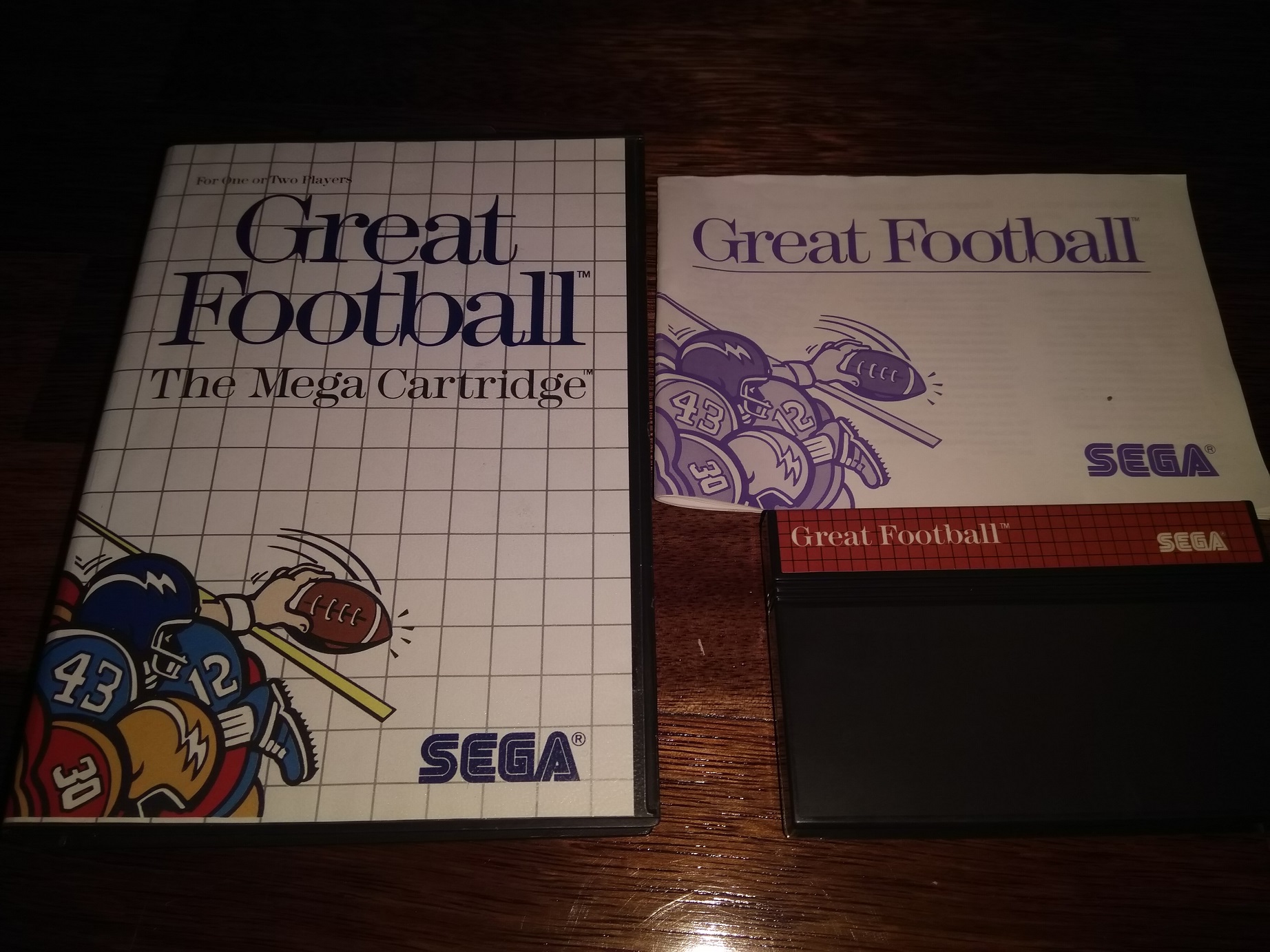 Continuando pelas rapidinhas a videojogos desportivos, e ainda na Master System também, o jogo que cá trago agora é de futebol americano, esse desporto que continua a ser algo incógnito para mim, se bem que já sei um pouco mais das suas regras. Este meu exemplar do Great Football veio no passado mês de Novembro de uma Cash Converters em Genebra, na Suíça, tendo-me custado algo em volta dos 8€.