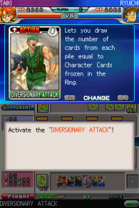 Entretanto, como Trading Card Game acho que o sistema até que é bastante sólido. Sinceramente já não me recordo bem das mecânicas de jogo dos primeiros jogos da Neo Geo Pocket, pois já os joguei (através de emulação) há mais de 15 anos seguramente, mas aqui as mecânicas são muito parecidas com as de Magic: The Gathering, para quem as conhecer. Possuímos 3 tipos de cartas distintas, as Character Cards, que tal como as criaturas standard de MTG apenas as podemos lançar no nosso turno, ficando bloqueadas sem poder atacar ou defender até ao nosso turno seguinte. Possuimos também as Action Cards, que tal como os Sorcery de MTG podemos apenas jogar no nosso turno, sendo estas cartas de suporte com habilidades distintas como regenerar os pontos de vida das nossas Character Cards ou alterar os seus atributos. Por fim temos os counters, também cartas de suporte mas que apenas os podemos jogar no turno dos nossos oponentes. Estas permitem-nos, por exemplo, desbloquear todas as cartas de Character que temos no tabuleiro, sejam cartas que tenhamos lançado no turno anterior, ou outras que tenhamos usado para atacar. Ou seja, tal como o MTG, as criaturas que usarem para atacar no nosso turno, não podem ser usadas para defender dos ataques do nosso oponente no turno seguinte. E claro, o objectivo é o de reduzir a vida do nosso oponente a zero.