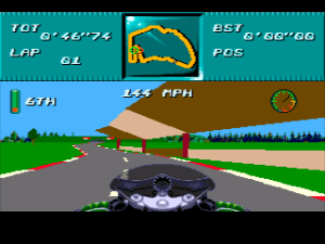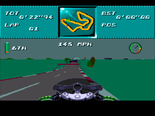 Continuando pelas rapidinhas na Mega Drive, vamos ficar com mais um jogo desportivo, nomeadamente de corridas de motos. Publicado pela Domark e produzido pelo mesmo estúdio que nos trouxe anteriormente o F1 e que utiliza o mesmo motor gráfico. Ou seja, temos aqui mais um jogo com uma forte componente gráfica em 3D poligonal e, embora não corra a 60fps, está longe disso, não deixa de ter alguma fluidez visto ser um jogo 3D sem recurso a qualquer hardware adicional. O meu exemplar foi comprado numa feira de velharias, no início do passado mês de Fevereiro, tendo-me custado 2€.