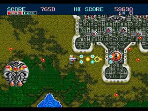Depois tanto num tipo de nível como no outro, iremos encontrar diversos power ups que os inimigos deixam depois de serem destruídos, estes consistem na sua maioria, diferentes tipos de armas, que poderemos alternar livremente entre elas com os botões A ou C. Estas podem ser diferentes tipos de raios laser, projécteis que dispersam na sua trajectória ou mesmo outros teleguiados. As armas que apanhamos nos níveis top down e sidescrolling horizontal são diferentes e claro, se perdermos uma vida, perdemos todos os power ups que tinhamos equipado até então, mas apenas as armas referentes ao tipo de nível que estamos a jogar no momento, as restantes mantêm-se. Outros power ups que podemos encontrar consistem em escudos que nos dão invencibilidade temporária, ou pequenas naves que orbitam à nossa volta, não só para nos proteger dos projécteis inimigos, mas também para ampliarem o nosso poder de fogo.