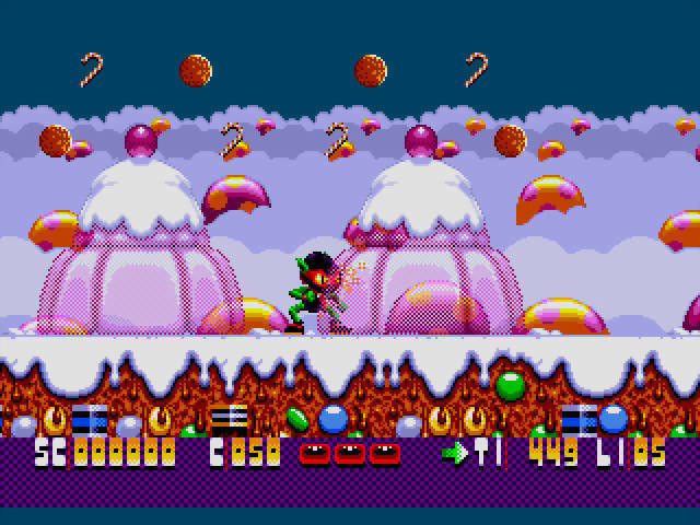 O objectivo em cada nível é o de procurar a sua saída, indicada por uma seta algures no fundo do ecrã. Mas antes de aproveitar a saída, teremos também uma quota de itens bónus para apanhar, quota essa que está directamente associada ao nível de dificuldade escolhido. Jogando em Normal apenas somos obrigados a apanhar 50% desses coleccionáveis, no Easy a quota passa para 25%, enquanto no Hard são 75%. Isto obriga-nos a explorar bem os níveis e seus recantos, o que como devem calcular acarreta algum risco pois temos vários obstáculos e inimigos para ultrapassar. Mas Zool é um ninja, e como todos os ninjas este é bastante ágil, possuindo uma série de habilidades no seu reportório. Por um lado move-se bastante rápido, pode escalar e saltar entre paredes, bem como agarrar-se a certas superfícies em alguns tectos. No que diz respeito aos controlos, temos um botão para Zool disparar a sua arma, outro para saltar e um outro para rodopiar enquanto salta, algo que recomendo vivamente que se habituem a fazer. Isto porque podemos derrotar os inimigos ao disparar sobre eles ou saltando-lhes em cima, mas como o jogo é bastante rápido, por vezes os inimigos surgem subitamente no ecrã, pelo que se estivermos a rodopiar enquanto saltamos, também lhes conseguimos infligir dano.