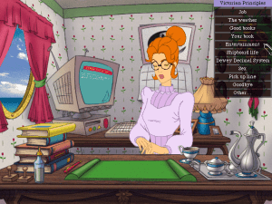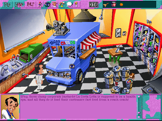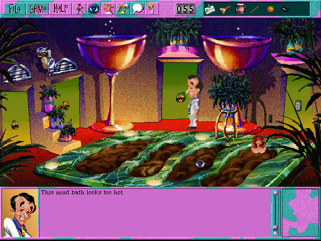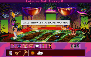 No que diz respeito aos audiovisuais, este último dos Larry clássicos é sem dúvida o melhor nesse departamento. Todos os cenários e personagens possuem uma vez mais um aspecto cartoony, mas as próprias animações são mesmo puros desenhos animados, o que a meu ver resulta bem. Temos música “a sério” a acompanhar a aventura, muitas delas focadas em temas jazz, com o próprio Al Lowe a interpretar alguns temas no seu saxofone, e muito voice acting, onde o narrador e o próprio Larry mantêm as mesmas vozes do jogo anterior. E sim, continua a ser um jogo extremamente bem humorado e com imensas referências sexuais, com algumas cenas de nudez pelo meio (mas temos de trabalhar bem para as conseguirmos desbloquear). Mas para além disso, é acima de tudo um jogo muito bem humorado. As miúdas que temos de conquistar são paródias de personalidades reais, como o caso de Drew Baringmore, Dewmi Moore ou Jamie Lee Coitus. Até um espectáculo de stand up comedy do Bill Clinton podemos assistir, com ele a contar algumas piadas um bocadinho más, muitas delas a ridicularizar a própria Hillary Clinton. Ou a sidequest onde teremos de encontrar os 32 dildos vestidos de Wally e perdidos no meio da multidão! É um jogo de facto muito bem humorado.