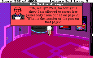Uma coisa que me esqueci de referir nos jogos anteriores é o sistema de protecção anti pirataria que tipicamente existem nos jogos da Sierra e no caso do Larry, o sistema de verificação de idades. Como os jogos do Larry tipicamente possuem algum conteúdo adulto, como cenas de nudez e inúmeras referências sexuais, até que fazia algum sentido implementarem controlos deste género. No primeiro jogo (e o remake de 1991), antes de começar a aventura é-nos questionada a nossa idade. Se for inferior a 17, o jogo salta logo fora, se dissermos que somos adultos, então teremos uma série questões de cultura geral para responder. Se acertarmos numas quantas, o jogo lá nos deixa começar a aventura, caso contrário, saltamos fora uma vez mais. O problema é que as questões são vocacionadas para adultos norte-americanos da época, pelo que vão haver umas quantas questões que não vamos saber responder. Felizmente que existe forma de fazer bypass a este controlo e, hoje em dia, também facilmente encontramos as suas respostas na internet. O segundo jogo não possui qualquer questionário de verificação de idade, pois as suas referências sexuais são menores, embora ainda existam ocasionalmente alguns pixeis marotos em cenas de nudez. Já neste Larry 3 os questionários de verificação de idade voltaram, mas desta vez não nos atiram borda fora se a nossa performance for má. Basicamente temos 5 questões para responder, uma vez mais de cultura geral nem sempre actualizada e focada no público norte americano. Mediante a percentagem de respostas acertadas, o nível de “censura” vai variando. Naturalmente eu procurei sempre acertar as respostas todas para ter acesso à versão o menos censurada possível e sim, neste Larry teremos muitas mais cenas de sexo e nudez, embora estejamos sempre a falar de coisas muito modestas e altamente pixelizadas.