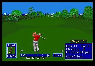 Começando pelo menu inicial, que ainda se assemelha bastante a um jogo da velha guarda do MS-DOS. No que diz respeito aos modos de jogo, temos os modos de treino Driving Range e Putting Green, que nos permite treinar precisamente as tacadas de abertura e o putting, onde já estamos próximos do buraco. Podemos jogar sozinhos um circuito de ponta a ponta no modo practice também, mas o grande desafio está mesmo no modo torneio onde já iremos competir contra todos os outros golfistas. O Skins Challenge, onde a pontuação é atribuida de forma diferente está também aqui presente, assim como outros dois modos de jogo, o “Match Play” e o “Shoot-Out”, que parecem ser modos de competição mais curtos. No que diz respeito às mecânicas de jogo, contem com o habitual. Teremos de ter em atenção a força do vento, a distância ao buraco, obstáculos naturais como água, poços de areia ou árvores e ter o cuidado seleccionar o melhor taco para cada situação. Antes de dar a tacada teremos portanto de ajustar a nossa direcção e quando o fizermos, temos os habituais “medidores de energia” que funcionam a dois tempos: primeiro seleccionamos a potência da tacada, depois o seu efeito.
