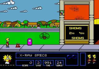 Como referi anteriormente, a história e o conceito é o mesmo das versões 8bit. Bart munido dos seus óculos raio-X descobre que extraterrestres estão entre nós a construir uma arma para dominar o mundo e cabe-lhe a ele travar os seus planos. Inicialmente essa máquina está a usar objectos roxos para o fabrico da tal arma, pelo que no primeiro nível a nossa missão vai ser a de pintar o máximo de objectos roxos que conseguirmos, seja com as latas de spray que vamos encontrando, seja com algum platforming mais exigente, ou mesmo com recurso a outros objectos que poderemos vir a adquirir. No segundo nível, passado num centro comercial, já teremos de coleccionar todos os chapéus que encontrarmos, pois a máquina passou a usar chapéus. No terceiro nível, passado numa feira Popular, o objectivo é apanhar ou rebentar o maior número de balões e por aí fora. É essencialmente o mesmo jogo, com os mesmos segredos e desafios. Confesso que descobri um segredo que nunca me tinha apercebido antes: no primeiro nível, as moedas que vamos encontrando podem ser usadas em algumas lojas para comprar objectos, até aqui tudo bem. Mas logo na primeira cabine telefónica a seguir ao Moe’s Tavern, poderemos usar o telefone para fazer uma das prank calls típicas do Bart! Fui depois experimentar o mesmo na versão Master System e também está lá presente! Muito engraçado!