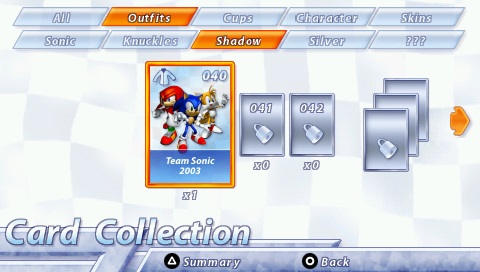 Para além do modo história, ainda dispomos de mais 2 modos de jogo adicionais na vertente single player, todos eles com as mesmas mecânicas das corridas de base. O Challenge coloca-nos a competir numa série de corridas sendo que teremos uns quantos objectivos múltiplos para cumprir em cada nível, como terminar o circuito dentro de um tempo limite, com um certo número de anéis coleccionados, atacar o oponente umas quantas vezes, entre outros. O outro modo de jogo single player é o Cup que são umas quantas corridas contra o CPU e o objectivo é ganhar mais corridas que o nosso oponente. A vertente multiplayer, que sinceramente não explorei, mas usava apenas o modo de rede ad-hoc, isto é, entre jogadores fisicamente próximos entre si e permitia-nos competir em corridas singulares, ou pequenos campeonatos. O outro modo é o Card Trade que permitia trocar cartas entre jogadores. Estas cartas são o grande coleccionável deste jogo e talvez a única desculpa para repetir os modos de jogo single player, pois teremos 150 para coleccionar, com figuras das personagens e inimigos de toda a série Sonic the Hedgehog desde 1991 até 2006. Acho piada ao factor nostálgico de ver ali o artwork de alguns inimigos dos primeiros jogos, mas não me dei ao trabalho de as coleccionar todas.