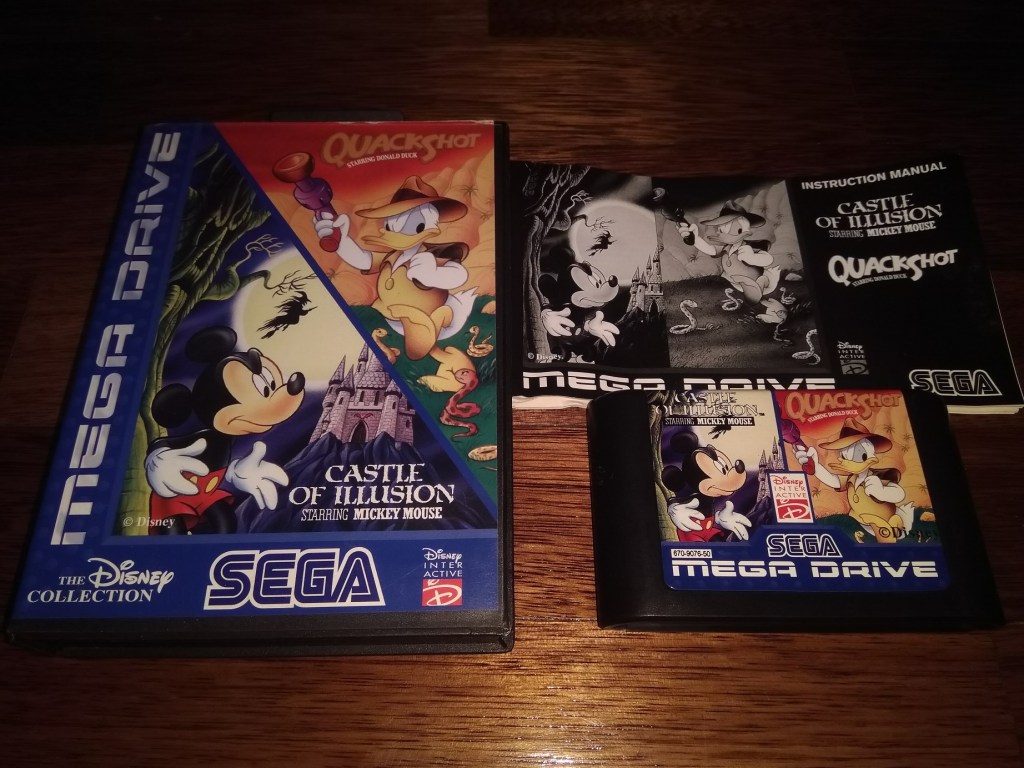 Vamos a mais uma super rapidinha, desta vez para a Mega Drive e vamos ficar com uma compilação de luxo, com dois dos mais icónicos jogos da Disney para a Mega Drive. É uma compilação que inclui nada mais nada menos que Quackshot e Castle of Illusion, os primeiros jogos do Donald e Mickey (respectivamente) que chegaram até à máquina de 16 bit da Sega. Curiosamente ou não, ambos foram desenvolvidos pela empresa nipónica. O meu exemplar foi comprado no passado mês de Outubro, tendo vindo de um bundle com vários outros jogos que me ficou a menos de 10€ por cada.