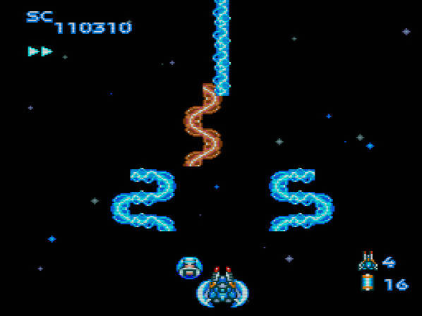 De resto este é um shmup bem competente, onde iremos enfrentar inúmeros inimigos e um boss no final do nível, se bem que ocasionalmente enfrentamos alguns midbosses também, ao longo de 9 níveis distintos. Devido ao enorme poder de fogo que poderemos ir amealhando com os inúmeros power ups que vão aparecendo, a primeira metade do jogo até que se joga bem sem dificuldades de maior, mas eventualmente a dificuldade vai escalando, com os inimigos a surgirem em maior número e com mais poder de fogo. Chegando ao nível 8 já tive de usar a magia dos save states (sim, joguei em emulação), pois este nível está repleto de bolhas mortíferas que temos de destruir. Se bem que algumas são indestrutíveis e expandem o seu tamanho em intervalos regulares, pelo que teremos de ter cuidados extra a desviarmo-nos delas também.