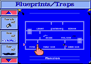 E este é um daqueles jogos em que dava mesmo jeito ter um manual, pois não saberia bem o que fazer a não ser que tivesse consultado um guia. Como seria de esperar, controlamos o Kevin Mc. Allister na sua luta contra os Wet Bandits, mas em vez de defender a sua casa, teremos de defender todas as casas lá do bairro dentro de um tempo limite (20 minutos na dificuldade normal, 40 na difícil). E como fazemos isso? Causando todo o tipo de dor aos bandidos, seja através de armadilhas, seja através de armas que podemos construir e equipar. Começamos a aventura com Kevin cá fora no seu trenó eléctrico, onde nos podemos movimentar entre as diferentes casas e coleccionar itens ao derrubar bonecos de neve. Ao entrar numa casa, se os bandidos não estiverem por lá, é-nos apresentado um ecrã com a planta da casa e poderemos escolher que armadilhas colocar e onde. Berlindes, tachas ou poças de óleo no chão, maçaricos nas portas, são algumas das possibilidades clássicas! Caso visitemos uma casa já depois de os ladrões lá entrarem, já não conseguimos preparar armadilhas.