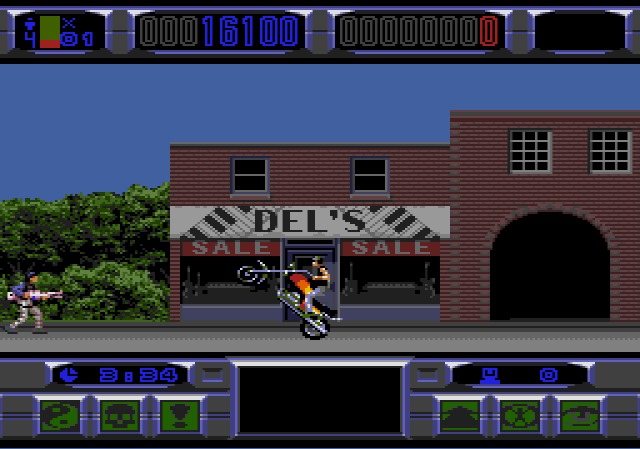 No que diz respeito à jogabilidade, este é um jogo bastante original e bizarro nesse aspecto. Começamos por jogar numa zona residencial e o jogo aí assume-se como um jogo de acção 2D sidescroller, onde com um botão disparamos a nossa arma, com o outro saltamos e o botão C serve para carregar e disparar uma outra arma especial. Aqui temos de jogar de forma cuidada pois os inimigos precisam de levar com uns quantos disparos, enquanto que a nós basta-nos levar com um tiro para perder uma vida. Iremos também encontrar imensos itens e power ups, que tanto nos fazem aumentar a pontuação, vidas extra ou servem de upgrade para a nossa arma. Os CDs que vamos encontrando, se coleccionados em número suficente, permitem-nos usar o Virtual Cyber Suit, que basicamente nos permite sofrer algum dano antes de perder uma vida. Ocasionalmente vamos encontrar também alguns terminais que podemos hackear, ao resolver uma série de padrões lógicos ao adivinhar que número ou símbolo irá surgir numa determinada série. Se conseguirmos desbloquear o terminal, este explode, libertando bastantes power ups para apanhar.