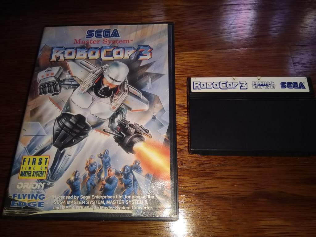 Vamos a mais uma rapidinha, pois já cá trouxe no passado o Robocop 3 para a Super Nintendo. Este tinha sido desenvolvido originalmente pela Ocean, que habitualmente detinha a licença dos filmes para produzir jogos para os microcomputadores da época e nas consolas da Nintendo também. Mas com o terceiro filme do Robocop, a Acclaim/Flying Edge acabaram também por adquirir a licença da Ocean para produzirem conversões desse mesmo jogo para consolas da Sega também. O meu exemplar da Master System chegou-me à colecção no passado mês de Novembro, após ter feito uma troca com um amigo.