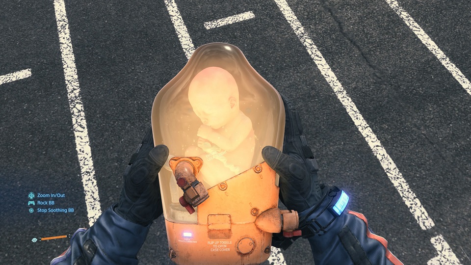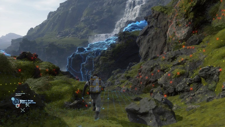 Ora e se o conceito em si já é bastante original, a jogabilidade e todas as suas mecânicas de jogo também o são. Nós seremos sempre um estafeta e todas as nossas missões consistem sempre em levar mercadoria do ponto A para o ponto B e quando chegamos a uma localização nova, deveremos também a tentar religar à Chiral Network. Para além disso, ao longo das nossas viagens iremos também encontrar mercadorias perdidas ou materiais que podem ser usados para crafting, pelo que também os podemos apanhar e entregar aos seus destinatários, ou simplesmente deixar num outro ponto para serem eventualmente recolhidos por outras pessoas. Ora e este Death Stranding é também um walking simulator, pois os caminhos a explorar são muitas vezes sinuosos e se tivermos muita carga às costas, o simples facto de caminhar será uma tarefa hercúlea e se cairmos, a carga que temos às costas também se danifica. Portanto antes de aceitar uma missão devemos ter em atenção os diferentes ícones de perigo no ecrã de briefing e prepararmo-nos devidamente. Por exemplo, se nos avisam que potencialmente iremos atravessar território de BTs ou MULEs (estes últimos são bandidos humanos que também nos atacam se nos virem), se calhar devemos então trazer também algum equipamento que nos ajudará a enfrentar essas ameaças. Se o caminho for muito montanhoso ou acidentado, se calhar convém trazer umas cordas ou escadas para ajudar a atravessar. Para além disso temos de ter também em conta a chuva ou neve que por si só também vai danificando toda carga e equipamento que tenhamos connosco.