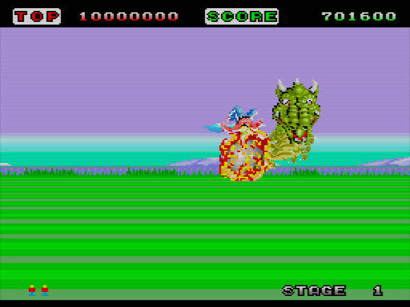 Então este é um shooter fantasioso onde a câmara fica directamente por detrás do nosso herói, dando-lhe um efeito 3D muito interessante para a época. Aliás, sendo este um jogo lançado originalmente nas arcades em hardware com a tecnologia super scaler, era de facto um jogo muito vistoso, não só pelo detalhe gráfico de todo aquele mundo fantasioso e bizarro, mas principalmente pela sua fluidez. Foram imensas as conversões lançadas deste jogo ao longo dos anos e para um vasto número de plataformas diferentes mas, infelizmente foi preciso esperar até ao lançamento da versão 32X para termos uma versão quase arcade perfect.