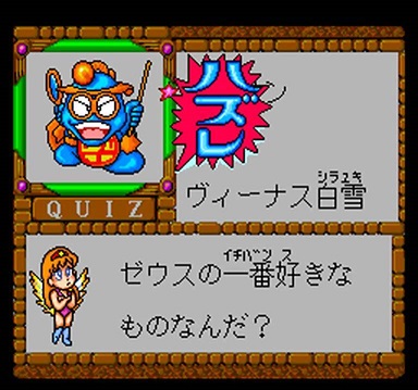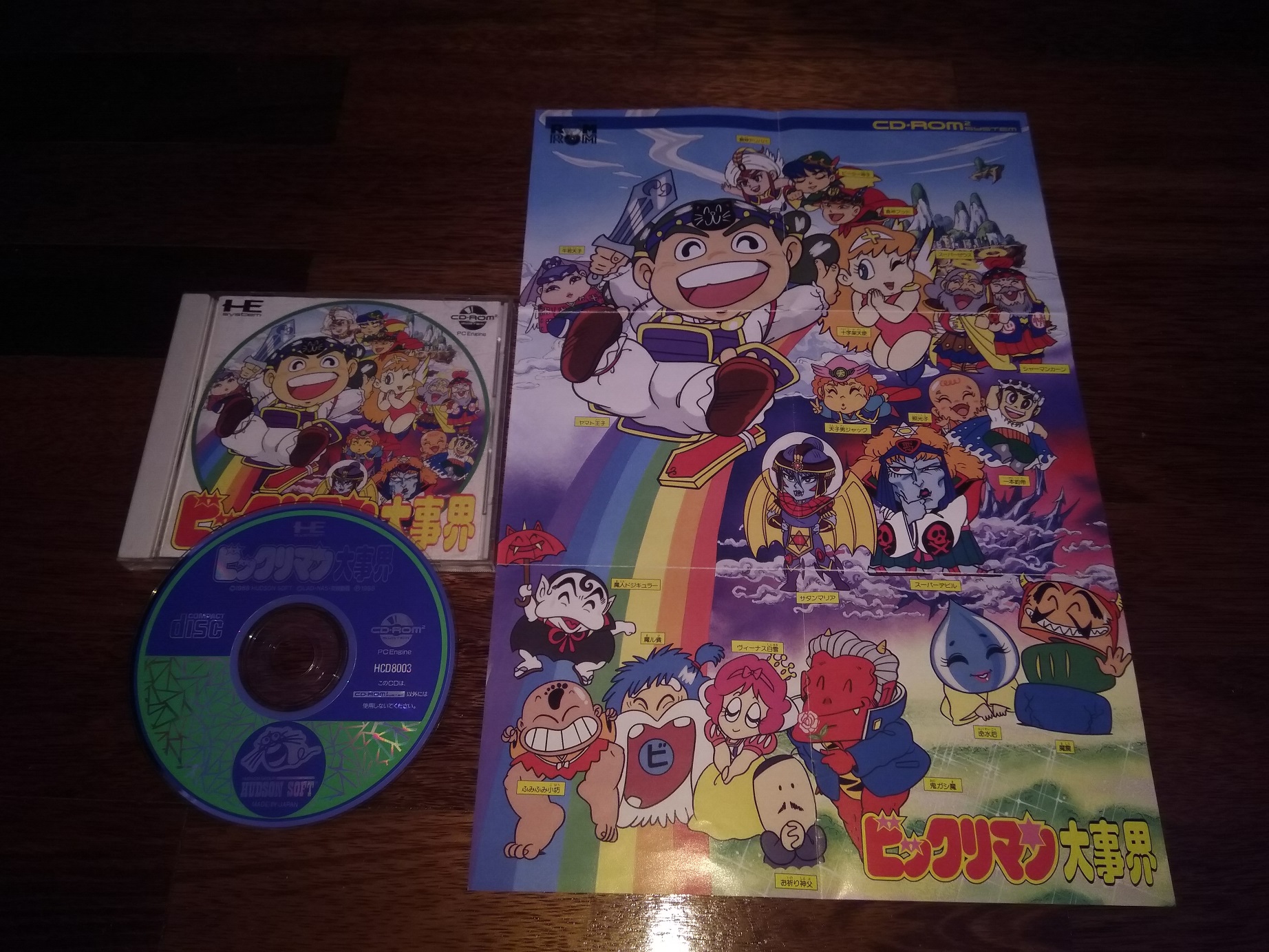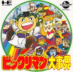 Ora Bikkuriman, pelo que invesiguei, é uma marca de chocolates japoneses que fizeram sucesso na década de 80 ao introduzirem uma colecção de cromos com personagens bizarras. Esse sucesso levou à criação de séries animadas, mas também videojogos. O primeiro videojogo Bikkuriman é na verdade uma adaptação do Wonder Boy in Monster Land pela Hudson, que já tinha lançado o primeiro Wonder Boy na MSX/Famicom/NES como Adventure Island e posteriormente a sequela na PC-Engine como Bikkuriman World. O jogo seguinte, já lançado em 1988 para o novíssimo sistema PC-Engine CD é então este Bikkuriman Daijikai. Então será este um jogo de plataformas como o primeiro? Antes fosse…