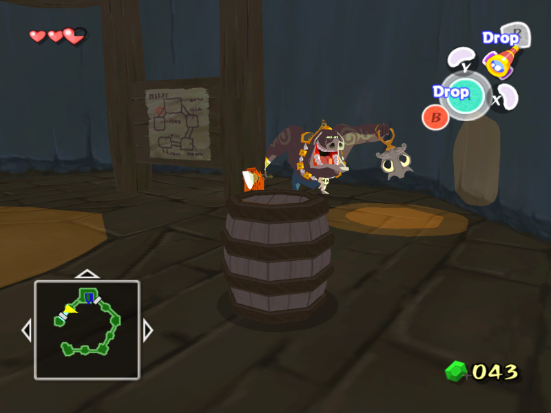 E este é então um Zelda muito distinto dos seus predecessores precisamente pelos seus oceanos! Aqui não há Eponas, mas depois da primeira dungeon conseguimos um pequeno barco falante que nos irá ajudar na aventura e navegar pelos oceanos, ao explorar as inúmeras ilhas que possuem pequenas vilas, dungeons e muitos segredos a descobrir. Como o subtítulo indica, em Wind Waker vamos também manipular o vento. Em vez de uma Ocarina como nos títulos da Nintendo 64, Link está agora munido de uma batuta de maestro e teremos uma vez mais de aprender diferentes melodias que nos darão habilidades distintas, como manipular a direcção para onde sopra o vento, e como temos um barco à vela, isso será fulcral para explorar os oceanos. De resto é um jogo com controlos algo semelhantes aos da Nintendo 64, com os botões X, Y e Z a poderem ter diferentes itens assignados, enquanto o botão B serve para atacar, o R para defender e o L para activar o lock on nalgum inimigo específico. O botão A possui um uso algo genérico e o segundo analógico controla a câmara.