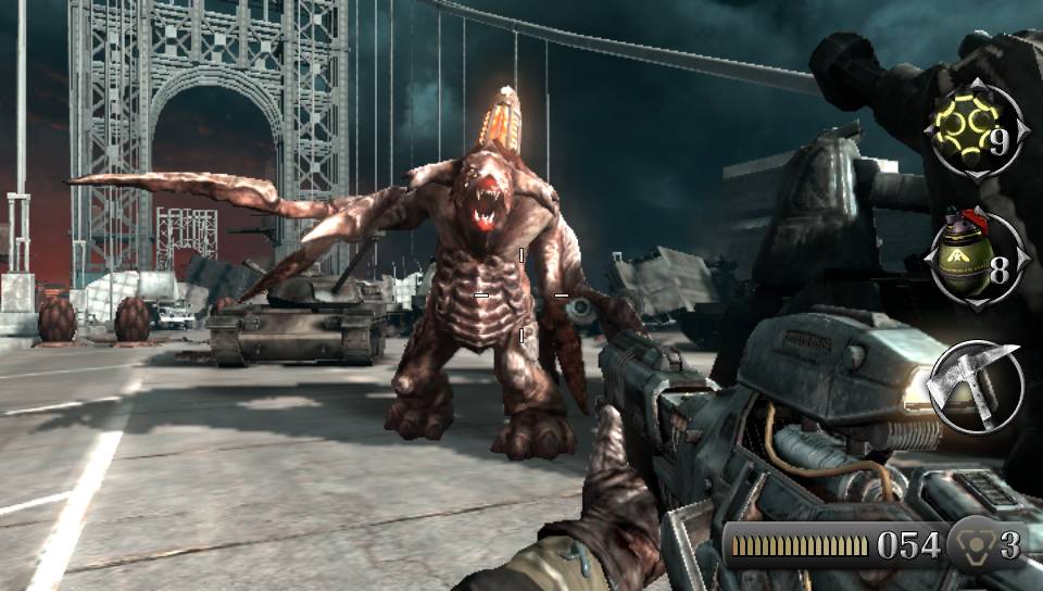 No que diz respeito à jogabilidade, esperem uma vez mais por um arsenal diversificado e onde poderemos carregar todas as armas de uma vez só. Para além disso, todas as armas têm modos secundários de fogo, como um lança granadas acoplado numa metralhadora, a possibilidade de criar escudos, ou de redireccionar o nosso fogo para um alvo que tenha sido tagado anteriormente. Todos esses modos de fogo secundários são activados usando o touch screen, o que sinceramente até acaba por resultar bem em quase todas as armas. E sempre que vamos necessitar de alguma dessas habilidades especiais, o jogo faz questão de pausar a acção e mostrar-nos um vídeo tutorial a mostrar como se activam essas funcionalidades. Para além disso, sempre que uma arma equipada e a sua funcionalidade secundária possa ser usada, temos sempre uma indicação visual mínima no ecrã a informar de que forma o touch screen é utilizado para a usar. Granadas e os ataques melee com o machado são também despoletados ao pressionar os seus ícones no ecrã táctil e sinceramente também é algo que resulta bem.