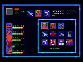 Ora este jogo leva-nos ao futuro num conflito interplanetário entre 2 organizações: o império militar dos Russo-American Mercantile (RAM) e a força da resistência dos NEO, ou New Earth Organization, da qual fazemos parte. O herói Buck Rogers irá aparecer algumas vezes ao longo da nossa aventura, mas nós encarnamos numa party de recrutas que iremos precisamente por começar a criar. Podemos então optar por seleccionar personagens masculinas ou femininas, dentro das raças Humana, Tinker ou Desert Runners e posteriormente a classe: Warrior, Rocket Jockey (o equivalente a Engineer), Rogue ou Medic (as personagens da raça Tinker, muito fracas fisicamente, podem ser apenas Medics). Depois lá lançamos os dados para serem atribuidos os nossos stats e felizmente podemos relançar os dados livremente até termos um resultado mais agradável. Em seguida temos 8 skill points que poderemos atribuir a uma série de diferentes skills que serão distintas de classe para classe. Tudo isto para cada personagem que criamos! Todas elas são importantes, mas os Warriors são imprescindíveis nos combates, os Rocket Jockeys para reparar a nossa nave e interagir com computadores ou outros sistemas electro-mecânicos e os Medics… bom, servem para curar os restantes membros da nossa party, pelo que também são muito importantes!