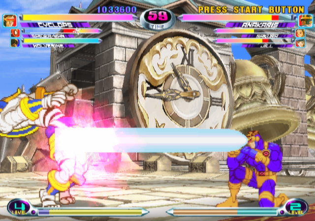 Já no que diz respeito aos audiovisuais, este Marvel vs Capcom 2 marca também pela sua diferença, tanto nos gráficos como no som. Começando pelos gráficos, este jogo não é inteiramente em 2D tal como os seus predecessores. As personagens continuam a ser em 2D, com um excelente nível de detalhe e animações. Já os cenários são completamente renderizados em 3D, embora a acção continue a decorrer num plano em 2D. Bom, eu prefiro cenários em 2D com pixel art muito bem detalhado, o que acontecia nos jogos anteriores, bem como nos da SNK. É verdade que os cenários não são feios, o resultado final nem é nada mau, mas é apenas uma questão de preferência. E infelizmente os cenários são um pouco genéricos, mas se a Capcom se desse ao trabalho de criar cenários específicos para cada personagem seria uma tarefa algo ingrata. Já no que diz respeito ao som, bom as personagens são bem perceptíveis, mas o que chama mesmo à atenção é a banda sonora, que agora é muito influenciada por ritmos e melodias jazz. Não estava nada à espera, mas as músicas até soam bastante bem!