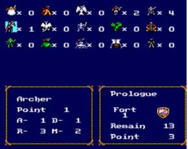 Mas sendo este um jogo tão primitivo no género dos SRPGs, as suas influências de RPG são ainda muito modestas. Existem 3 modos de jogo distintos: o Scenario, Construction e Campaign, mas antes de entrar no detalhe de cada um, fiquemo-nos primeiro pelos básicos. Este é então um jogo de estratégia por turnos, onde vamos participando em várias batalhas e cujo campo de batalha está dividido numa série de quadrados. A iniciativa é calculada de forma aleatória no início de cada turno, pelo que poderemos ser nós ou o inimigo a começar o turno primeiro. E é aqui que poderemos seleccionar cada unidade que controlamos, movimentá-las pelo cenário e posteriormente atacar alguma unidade inimiga, se esta estiver dentro do alcance de ataque, claro. Vamos tendo unidades de diferentes tipos e classes, como guerreiros, arqueiros, peças de artilharia, dragões voadores, navios, entre outros, sendo que cada tipo de unidade tem os seus respectivos pontos de defesa e ataque, bem como diferentes alcances de movimento e ataque. Por exemplo, unidades mais pesadas não conseguem cobrir grandes distâncias num turno, unidades com armas brancas como espadas ou machados não conseguem atacar à distância, ao contrário dos arqueiros, ou os navios não podem mover-se em terra. Já as unidades aéreas, têm uma grande liberdade de movimento e podem cobrir todo o tipo de terrenos. Portanto todas as unidades que vamos controlando vão tendo as suas particularidades e vamos ter de as usar de forma muito inteligente para contrariar as movimentações inimigas!