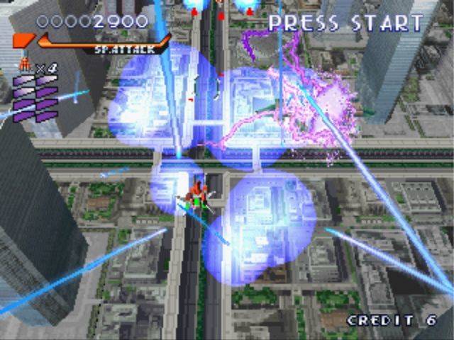 A nível de jogabilidade é um jogo simples, onde inicialmente dispomos de 2 modos de jogo distintos para escolher, com a conversão arcade, mas também o modo “extra”, onde este último parece ser apenas uma versão remix da versão arcade, com mais inimigos e diferentes padrões de movimento e disparo. Inicialmente podemos escolher uma de 2 naves, que possuem armas diferentes, mas com uma jogabilidade idêntica. Aqui temos 2 botões de disparo, um para disparar os raios laser com rapid fire, outro para fazer lock-on de inimigos e, quando o largamos, são lançados projécteis teleguiados que atacarão os mesmos. Para além de armas diferentes, o número de alvos que conseguimos fazer lock-on também varia de nave para nave. De resto temos ainda um outro botão usado para despoletar o special, um ataque bastante poderoso e que causa dano a todos os inimigos presentes no ecrã! Este não tem propriamente munições limitadas, simplesmente apenas o podemos usar quando a barra de special esteja cheia, o que vai acontecendo gradualmente, com cada ataque de “lock on” bem sucedido. E para fazer lock-on nos inimigos, não basta carregar no tal botão, temos também de guiar a nave para que a sua mira, que paira um pouco à sua frente, entre em contacto com os inimigos. Ora como essa mira não está assim tão longe da nave quanto isso, também nos obrigará a conduzir a nave para muito próximo das naves inimigas, o que é naturalmente bem mais arriscado.