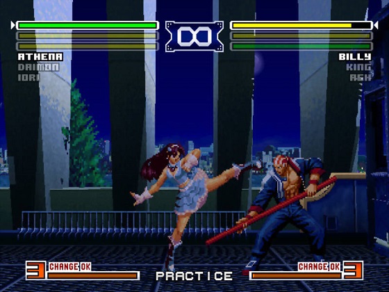 Já no que diz respeito a mecânicas de jogo, uma vez mais houve umas quantas mudanças consideráveis. O modo arcade (que também está aqui representado na conversão PS2) coloca-nos uma vez mais a combater com equipas de 3 lutadores, mas desta vez não há cá rondas múltiplas, os combates são bastante mais fluídos. Uma vez derrotado um lutador, salta para a acção o seguinte! Para além disso a SNK incluiu um sistema de tag team, permitindo-nos trocar de lutador a qualquer momento, existindo até alguns ataques especiais que podemos desencadear aquando do momento da troca, que gastarão uma das barras de special. Inicialmente cada lado poderá acumular 3 barras de special, que poderão chegar a um máximo de 5, consoante o número de lutadores da equipa que tenham sido derrotados. A versão PS2 adiciona uns quantos modos de jogo adicionais, como a possibilidade de jogar no esquema antigo de equipas de 3, divididos por rounds e sem a possibilidade de tag team, ou combates de 1 contra 1 apenas. Tanto num como no outro, podem ser jogados sozinhos ou contra um amigo. Para além do habitual modo de treino, temos também dois survivals distintos, um de combates de 1 contra um, outro de equipas.
