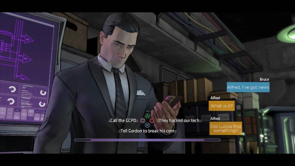 A nível gráfico é um jogo que segue os mesmos visuais da série Walking Dead da Telltale, com os seus gráficos algo cel shaded e que sinceramente resultam bem, pois Batman surge precisamente de um contexto de banda desenhada. O voice acting é, como habitual nos jogos da Telltale, excelente e a banda sonora acompanha bem a narrativa, alternando entre temas mais atmosféricos ou mais épicos consoante o contexto. Para além disso, toda a acção é apresentada de uma forma algo cinemática e que também resulta bastante bem. Até aqui tudo bem, mas pelo menos na PS4 o jogo está repleto de problemas técnicos. Para além de quebras graves de framerate (o que já me tinha habituado nos jogos da Telltale na PS3), o jogo está repleto de glitches gráficos e problemas de audio. Em relação a estes últimos, por vezes há diálogos inaudíveis, mas que estão presentes nas legendas, outras vezes é ao contrário, ouvimos diálogos, mas nada é escrito nas legendas. Também me aconteceu por vezes a música ser interrompida abruptamente a meio de uma conversa e só retornar quando se muda de cena. No que diz respeito aos bugs gráficos, temos coisas como a imagem ficar desfocada do nada (e não me parece que seja propositado), conseguir ver o interior da cabeça do Bruce nalgumas cutscenes ou alguns problemas de renderização de certos efeitos especiais de luz/sombras e afins. Por exemplo, o mais gritante é o fumo dos cigarros do Gordon, que aparece sempre no ecrã como formas brancas opacas. Parece que fizeram recortes de uma folha de papel e colaram! Mas tal como referi acima, isto na versão PS4. No PC não sei se terá os mesmo problemas.