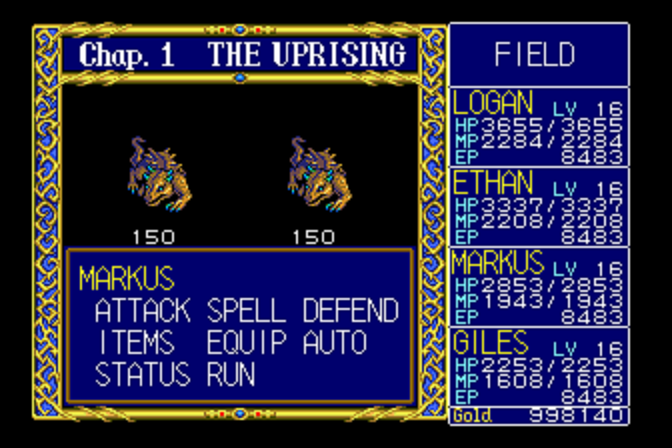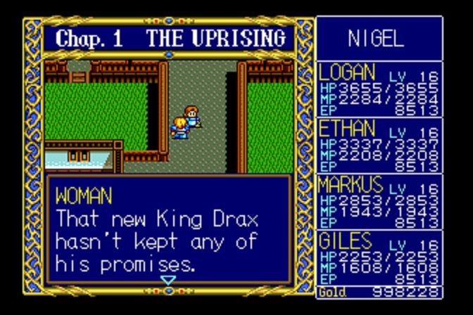 Já no que diz respeito às mecânicas de jogo, não esperem por nada de muito complicado. Este é então um JRPG típico com batalhas por turnos e encontros (algo) aleatórios. Digo algo aleatórios pois os inimigos estão presentes no ecrã do mapa mundo ou dungeons, mas estão invisíveis a menos que usemos algum item para revelar a sua localização. E mesmo que revelem a sua localização, os inimigos que vagueiam pelo ecrã possuem todos a mesma sprite genérica, pelo que só ficam a saber quem são quando entram num combate. Os combates são por turnos onde no nosso turno temos as típicas acções que podemos desempenhar: ataque físico, defender, usar item, usar magia, fugir, entre outros. Uma das acções que podemos definir são as batalhas automáticas, o que é uma óptima maneira de acelerar o processo de grinding. Uma das outras particularidades a mencionar é o facto de, cada vez que uma das nossas personagens sobe de nível, poderemos assignar os skill points ganhos livremente em categorias de força, inteligência, velocidade e sorte. O sistema de magias também é algo fora do convencional neste jogo, na medida em que não há propriamente classes no jogo, cada personagem pode aprender as magias que quiser. E estas não são aprendidas à medida em que subimos de nível, mas sim, devem ir sendo compradas ao longo do jogo. Na verdade nem são compradas, as magias vão sendo oferecidas por alguns NPCs específicos e poderemos assigná-las livremente ao nosso grupo, tendo em conta que cada personagem possui 7 slots disponíveis.