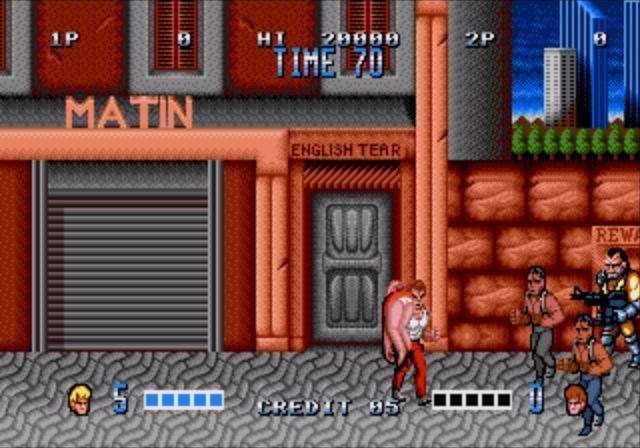 De resto, como já referi acima, uma das novidades que o Double Dragon introduziu foi o multiplayer cooperativo (e esta versão também o permite para 2 jogadores, até porque os protagonistas são dois irmãos). A outra era o facto de não só podermos apanhar algumas armas do chão, como rochas, ou bidões que poderíamos arremessar para os inimigos, mas também poderíamos roubar as armas que os inimigos carregassem com eles (ao enchê-los de porrada, claro!) como bastões de basebol, chicotes ou facas e usá-los no combate também. Mas infelizmente isso também é um problema nesta conversão. É que nós até nos movemos bem rápido, o problema é que os inimigos também e a sua inteligência artificial é extremamente irritante, pois eles replicam os nossos movimentos pelos cenários, pelo que é practicamente impossível arranjar espaço para respirar caso sejamos cercados, a menos que consigamos atacar primeiro e de forma rápida, o que nem sempre acontece. E com isto quero dizer que, quando nos preparamos para apanhar uma arma, rapidamente os inimigos se aproximam de nós e quando a animação de apanharmos a arma termina estamos a meros instantes de levar um porradão.