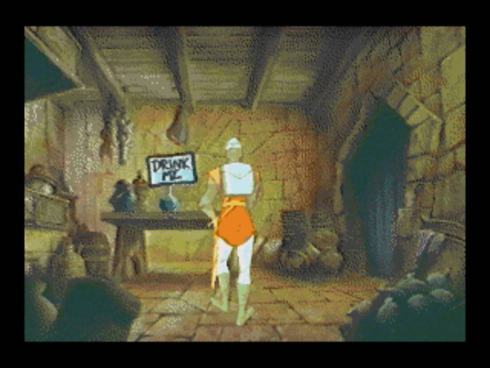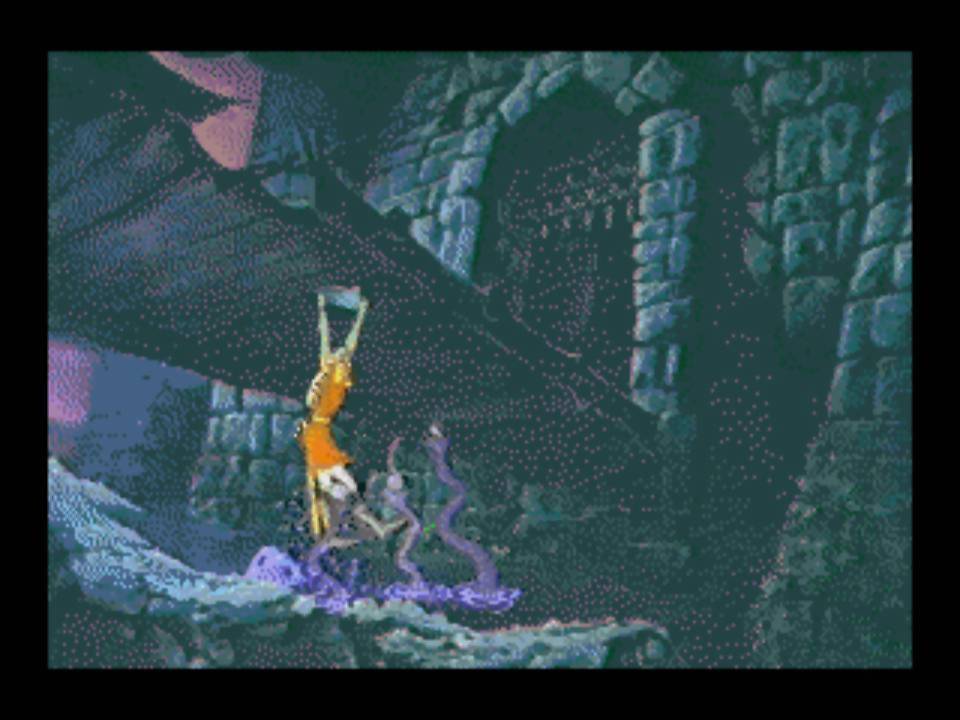 Já cá trouxe no passado um Dragon’s Lair para a Super Nintendo, mas essa versão teve mesmo de ser muito diferente da original arcade, pois a consola não poderia mesmo reproduzir conteúdo em full motion vídeo, muito menos com a capacidade de armazenamento limitada de um cartucho (algo que não impediu que versões surpreendentes para o Amiga 500 ou mesmo Gameboy Color viessem a ser também lançadas). A Mega CD era diferente, como os inúmeros títulos FMV praguejaram a biblioteca de jogos deste sistema. Tal como referi acima, o Dragon’s Lair era essencialmente um filme interactivo que contava a história do cavaleiro Dirk the Daring, porém algo medroso e trapalhão, que buscava salvar a princesa Daphne das garras de um dragão que a raptou. Teríamos então de explorar um castelo repleto de inimigos, obstáculos e armadilhas até que finalmente iríamos defrontar o tal dragão.