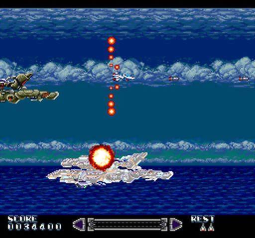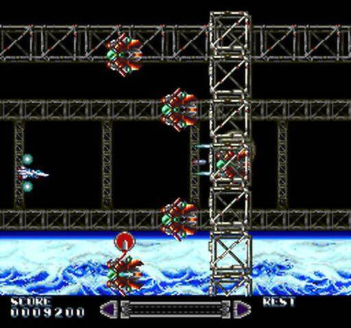 Existem apenas 6 níveis, divididos entre 3 checkpoints (início, meio e boss) pelo que se perdemos uma vida recomeçamos no último checkpoint que atravessamos (e como devem calcular enfrentar um boss sem power up nenhum é uma tarefa árdua) e gastando as vidas todas podemos usar um continue, que nos obriga a recomeçar o nível em questão desde o início. Temos continues infinitos, mas acreditem que o jogo é extremamente desafiante e nem é por haver muitas balas no ecrã. É que para além do facto de estarmos under powered o jogo todo e existirem muitos inimigos que são autênticas esponjas de balas, existem alguns níveis em particular que nos vão levar à loucura. O quarto nível é passado numa caverna cheia de paredes de gelo. As nossas armas não destroem o gelo, mas a nave sim. No meio das paredes de gelo vemos algumas bolsas de ar onde estão lá algumas rochas aprisionadas, a moverem-se constantemente e fazer ricochete nas paredes. Depois começam a surgir algumas naves inimigas (incluindo vermes gigantes) que nos perseguem e também eles vão abrindo caminhos pelo gelo, muitas vezes soltando essas rochas que começarão a fazer ricochete pelo resto dos cenários. Como as nossas balas não destroem as paredes de gelo, vai ser um nível incrivelmente frustrante. Mesmo com save state não foi fácil! O quinto nível já é um daqueles mais “biomecânicos” à lá R-Type, mas que está no entanto repleto de passagens estreitas e repletas de inimigos que nos temos de esgueirar pelo meio. O sexto e último nível é também um túnel que nunca mais acaba, repleto de passagens estreitas, turrets que disparam por todos os lados e outras naves ou obstáculos que nos obrigarão a possuir nervos de aço e reflexos de ninja.