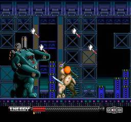 Graficamente até que é um jogo interessante, como irei detalhar um pouco mais em seguida, mas as imagens enganam pois a jogabilidade é horrível. A nível de controlos não há muito que enganar pois temos um botão para saltar, e um outro para que o nosso mecha ataque com a sua espada. Os níveis são todos num estilo 2D sidescroller onde teremos de limpar todos (ou quase todos) os inimigos do ecrã, avançar até ao final do nível e destruir uma barreira que nos permita avançar para a zona seguinte, onde teremos de repetir o processo e eventualmente enfrentar um boss. A partir de certa altura herdamos um equipamento novo, uma espécie de satélite que flutua em cima de nós. Para além dessa esfera absorver qualquer dano que a atravesse, a ideia é que, ao manter o botão de ataque pressionado durante alguns segundos, essa esfera se carregue de energia e ao soltar o botão de ataque mais um direccional, lancemos o satélite nessa direcção causando dano no primeiro alvo que tocar.