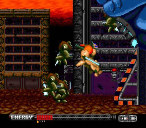 É isto o jogo todo e o problema está precisamente na jogabilidade que apesar de simples, está longe de ser refinada. Os inimigos surgem em grande número, rápidosm agressivos e são todos autênticas esponjas de dano. Será impossível não sofrer dano em muitos momentos, dano esse que nem sempre é consistente, pois o ataque que sofremos pode não causar dano, tirar-nos apenas um ou dois traços da barra de vida, ou uma grande parte de uma só vez… e isto para o mesmo inimigo/ataque! Vamos ter então de pressionar constantemente o botão de ataque, não só para causar dano mas também para prevenir que os projécteis dos inimigos nos atinjam e eventualmente saltar para evadir alguns ataques também. Infelizmente os power ups que nos regeneram a barra vida são raros e a nossa barra de vida não é restabelecida entre níveis, pelo que vai ser um jogo bastante desafiante por essa razão.