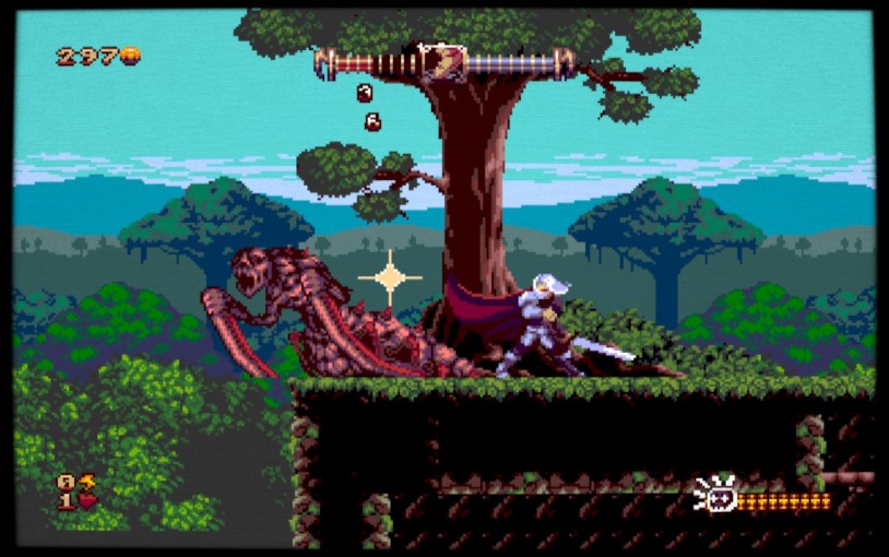 Ora este é então um jogo de acção em 2D sidescroller que, apesar dos seus criadores dizerem que contém elementos de metroidvania, isso acaba por não ser bem verdade, pois o jogo é bastante linear (embora existam áreas de exploração um pouco mais aberta) e acima de tudo dividido em níveis. Mas não deixou de ser uma óptima surpresa a meu ver! Mas vamos começar pelo básico, ou seja, pelos controlos. O botão A serve para atacar com a espada, botão B para saltar e o C para usar magias que tenhamos eventualmente desbloqueado. Mas Gareth é um guerreiro bastante ágil, pelo que poderemos também saltar entre paredes, ou fazer uma espécie de roll com B e baixo, permitindo-nos desviar rapidamente de ataques inimigos. E caso tenhamos desbloqueado esse ataque, poderemos ao saltar, pressionando A e baixo, lançar um ataque inferior que nos faz ganhar alguma altura adicional ao atacar os inimigos e com isso alcançar zonas que de outra forma não conseguiríamos lá chegar. Mais perto do final do jogo iremos jogar momentanteamente com outras personagens e o próprio Gareth, sem querendo estragar a surpresa, irá também ganhar habilidades diferentes.Cada nível terá os seus desafios tanto de platforming com puzzles à mistura, como de combate, existindo zonas em que só nos permitem avançar caso derrotemos todos os inimigos no ecrã.