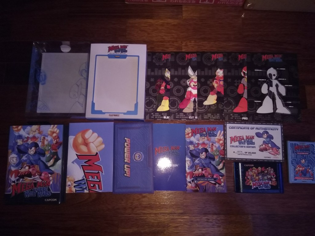Em relação ao The Wily Wars em si, este foi o primeiro lançamento da série Mega Man a chegar a um sistema da Sega, nomeadamente a Mega Drive. Aparentemente a Capcom terceirizou o seu desenvolvimento que acabou por se tornar bastante atribulado, o que levou a que o próprio Keiji Inafune (criador da série) a envolver-se pessoalmente no processo. Esta compilação acabou então por ser lançada em 1994 nos vários mercados, embora nos Estados Unidos o jogo tenha sido lançado exclusivamente no serviço do Sega Channel. Este era uma subscrição em que os consumidores de televisão por cabo poderiam ter acesso a vários jogos da Mega Drive que seriam descarregados para a consola. Era um sistema inovador para a época mas ainda muito primitivo, até porque os jogos descarregados seriam apagados sempre que a consola fosse desligada, por exemplo. Ora isso levou a que esta compilação se tornasse bastante coleccionável, particularmente pelos norte-americanos que não chegaram a ter acesso a este jogo por vias de retalho normal, inflaccionando bastante seu o preço nos círculos habituais. Felizmente que a empresa norte-americana retro-bit, que já há alguns anos que tem vindo a relançar, de forma legítima, certos jogos para sistemas retro, relançaram, no final de 2021, uma nova edição física deste título. Naturalmente, sendo devidamente licenciada pela Capcom, tornou-se numa óptima maneira de ter acesso a este lançamento de forma legítima e bem mais económica. O meu exemplar foi-me cedido por um amigo que por engano comprou 2 unidades. Custou-me 75€, sendo esta uma das edições limitadas da retro-bit que inclui muito conteúdo adicional.