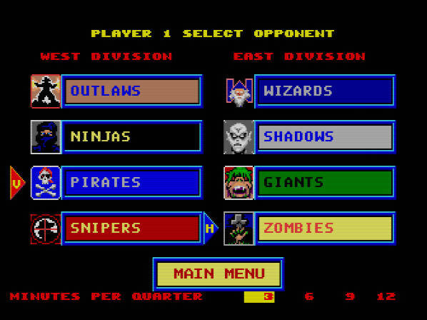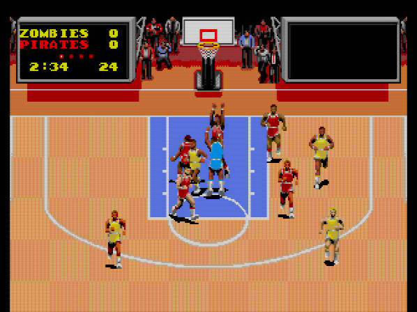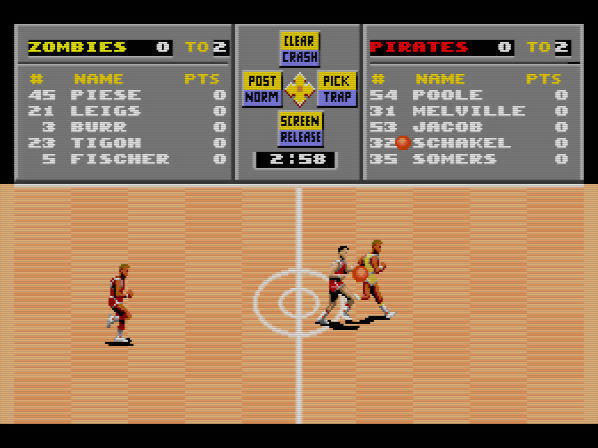 Este é suposto ser um simulador mais realista do desporto, mas como não possui nenhuma licença da NBA, todas as equipas e jogadores são fictícios. No que diz respeito aos modos de jogo, temos o exhibition que é uma partida amigável e pode ser jogado sozinho contra o CPU ou em multiplayer até um máximo de 5 jogadores, algo que eu não experimentei, até porque o multitap que eu tenho é da PC-Engine e não funciona numa Turbografx-16 sem um adaptador… Depois temos o League que seria um modo temporada e um clipboard onde poderíamos explorar as estatísticas de cada equipa e o seu calendário para a temporada desportiva.