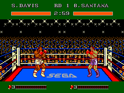 Mas vamos para o jogo em si. Aqui nós encarnamos num lutador de boxe fictício (ao contrário da versão norte americana que protagonizava o tal James Douglas) e o objectivo vai ser o de vencermos uma série de combates, contra oponentes cada vez mais poderosos. Os controlos até têm o que se lhe diga, pois o jogo é apresentado numa perspectiva lateral. Os botões 1 e 2 servem portanto para dar socos com o punho esquerdo ou direito, respectivamente, enquanto o d-pad pode servir para nos movimentarmos pela arena (esquerda ou direita) ou para defesa, ao bloquear a cabeça ou o corpo (cima ou baixo, respectivamente). Combinações de botões faciais com o d-pad poderão servir para desencadear outros tipos de golpes como uppercuts. Caso mantenhamos os botões 1 e 2 pressionados em simultâneo, poderemos ver, na parte baixa do ecrã uma barra de energia a encher-se e quando estiver no máximo, soltamos os botões e vemos a nossa personagem a despoletar um super soco, capaz de tirar de uma vez uma percentagem considerável da barra de vida do oponente. Nota que os oponentes podem fazer o mesmo connosco! Apesar de todas estas possibilidades, no fim de contas isto acaba por ser um button masher e esperar que consigamos acertar mais golpes do que o adversário.