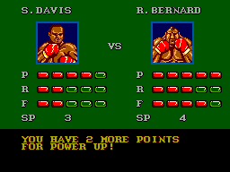 Mas vamos para o jogo em si. Aqui nós encarnamos num lutador de boxe fictício (ao contrário da versão norte americana que protagonizava o tal James Douglas) e o objectivo vai ser o de vencermos uma série de combates, contra oponentes cada vez mais poderosos. Os controlos até têm o que se lhe diga, pois o jogo é apresentado numa perspectiva lateral. Os botões 1 e 2 servem portanto para dar socos com o punho esquerdo ou direito, respectivamente, enquanto o d-pad pode servir para nos movimentarmos pela arena (esquerda ou direita) ou para defesa, ao bloquear a cabeça ou o corpo (cima ou baixo, respectivamente). Combinações de botões faciais com o d-pad poderão servir para desencadear outros tipos de golpes como uppercuts. Caso mantenhamos os botões 1 e 2 pressionados em simultâneo, poderemos ver, na parte baixa do ecrã uma barra de energia a encher-se e quando estiver no máximo, soltamos os botões e vemos a nossa personagem a despoletar um super soco, capaz de tirar de uma vez uma percentagem considerável da barra de vida do oponente. Nota que os oponentes podem fazer o mesmo connosco! Apesar de todas estas possibilidades, no fim de contas isto acaba por ser um button masher e esperar que consigamos acertar mais golpes do que o adversário.