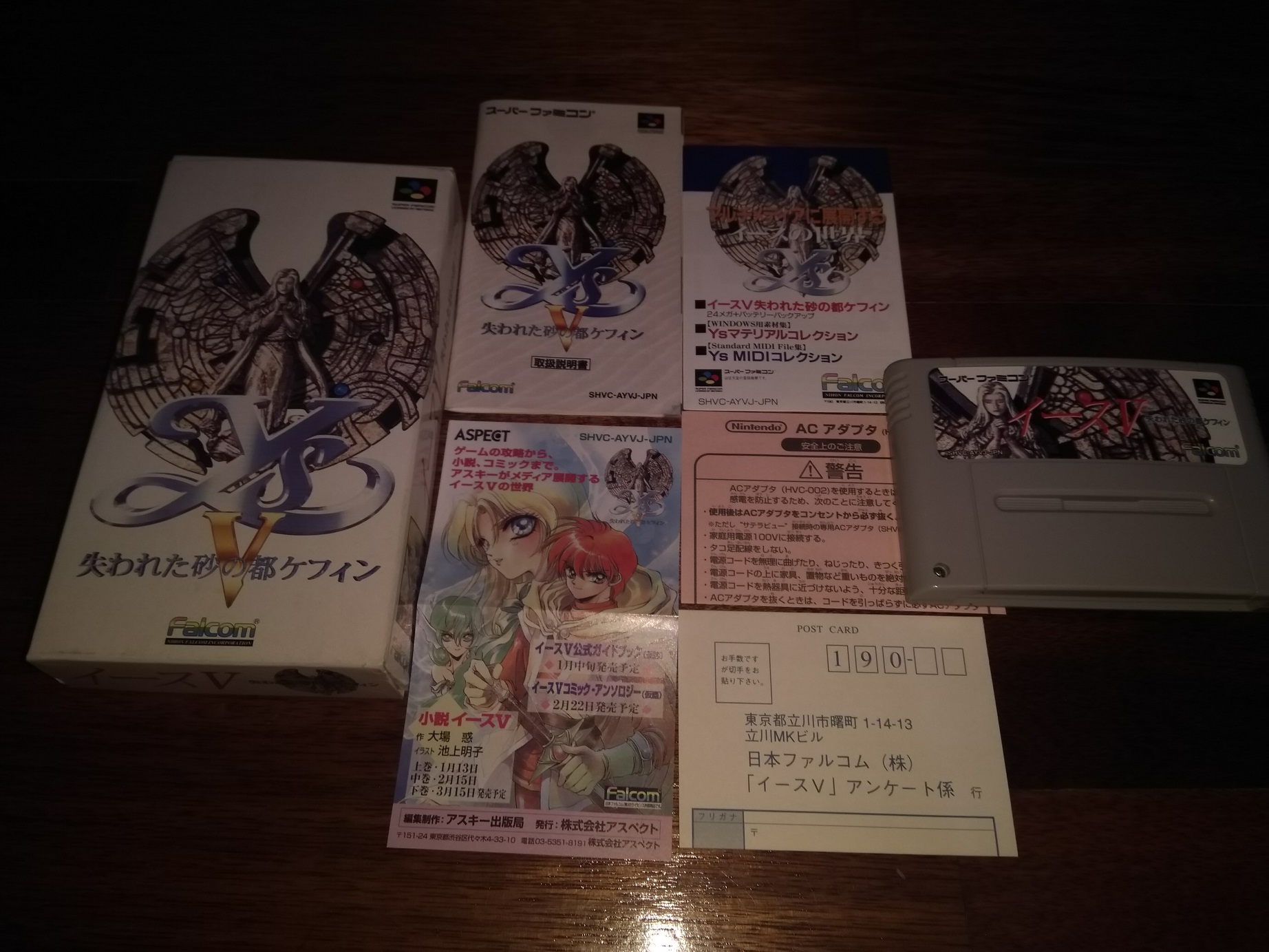 O Ys V é o primeiro em vários pontos: é o primeiro Ys a ser desenvolvido pela Falcom exclusivamente a pensar em consolas (até porque saiu exclusivamente para a Super Famicom e anos mais tarde recebeu um remake por parte da Taito que se ficou na PS2 no Japão), enquanto os seus predecessores foram desenvolvidos para computadores nipónicos e posteriormente convertidos para outros sistemas. Os Ys IV, apesar de originalmente terem sido lançadas versões para a Super Famicom e PC Engine CD, ao menos tinham sido inicialmente planeados pela Falcom para saírem em computadores, o que acabou por não acontecer. Ys V é também o primeiro jogo da série, pelo menos com este tipo de perspectiva vista de cima, onde temos um botão de ataque, em vez de irmos contra os inimigos. O meu exemplar foi importado directamente do Japão algures em Fevereiro deste ano, tendo-me custado uns 30€ mais portes e custos alfandegários.