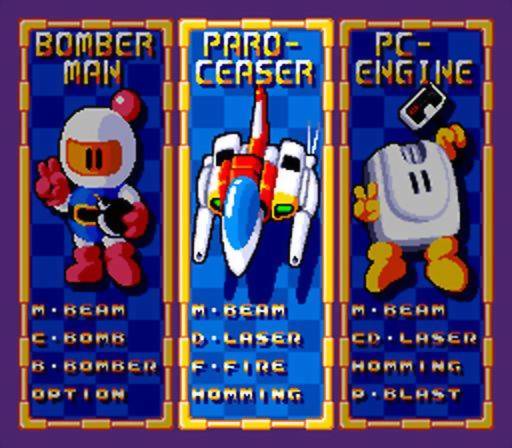 Cada nave possui diferentes tipos de armas, pelo que a sua jogabilidade será então ligeiramente diferente entre si. No entanto as mecânicas de jogo base são idênticas independentemente da nave escolhida. Basicamente vamos obter vários power ups coloridos, cujos ícones são diferentes consoante a nave escolhida. Se jogarmos com o Paro-Caesar temos ícones semelhantes aos Star Soldier, se o Bomberman temos ícones semelhantes aos power ups dos Bomberman clássicos enquanto se escolhermos a PC-Engine temos Hu-Cards coloridos como ícones. Cada cor corresponde a uma diferente arma, e se apanharmos itens de outra cor trocamos para outra arma, enquanto que se apanharmos itens da mesma cor melhoramos a arma equipada. Outros itens como escudos, vidas extra, bombas (armas especiais capazes de causar dano a tudo o que mexa) ou até options, aquelas pequenas naves que nos acompanham e uma vez mais terão diferentes comportamentos consoante a nave com que estamos a jogar. De resto o jogo está dividido em 8 níveis sempre com um mid-boss e um outro boss final. Para além do modo de jogo normal, temos ainda a possibilidade de experimentar alguns caravan modes, onde com um limite de 2 ou 5 minutos temos de fazer a melhor pontuação possível.