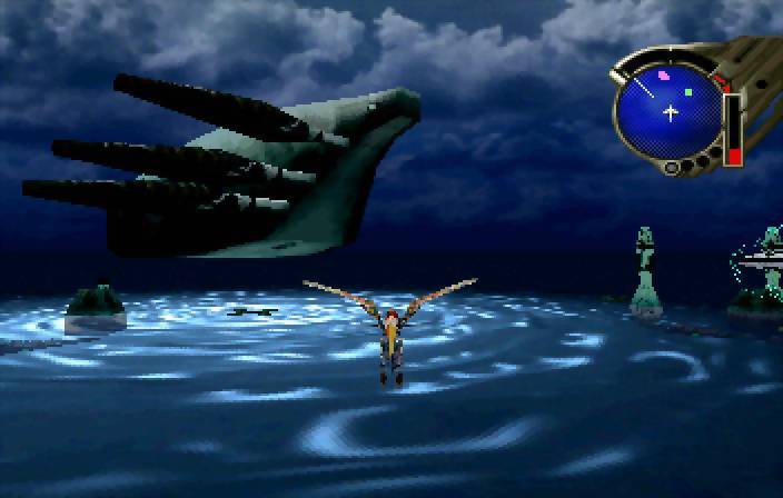 No que diz respeito às mecânicas de jogo, estas são bastante diferentes do habitual em JRPGs da época. A maior parte do tempo andamos às costas do dragão, que podemos controlar totalmente enquanto exploramos os cenários livremente. Mas também podemos andar a pé, algo que será necessário quando exploramos aldeias, vilas ou outras localizações pequenas como o nosso próprio acampamento. Mesmo quando andamos a pé o jogo traz algumas influências dos Panzers anteriores pois interagir com personagens ou outros objectos não é tão simples como chegar ao pé dos mesmos e pressionar um botão. Tal como quando viajamos nas costas do dragão temos de carregar nos botões A ou C para entrar no modo lock-on onde surge um cursor no ecrã que podemos mover livremente com o d-pad e aí sim interagir com as pessoas/objectos desejados. Esta foi talvez a mecânica de jogo que achei mais estranha, mas tendo em conta que a mesma se mantém quando viajamos nas costas do dragão, até faz algum sentido.