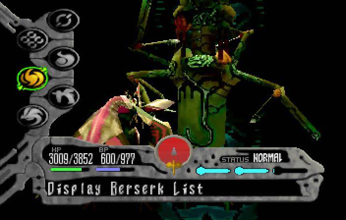 Quando exploramos os cenários com o dragão, iremos ter de travar inúmeros combates e o sistema de batalha é também bastante original. Estas são maioritariamente aleatórias e usam uma espécie de active battle system introduzido pelos Final Fantasy. Ou seja, para efectuarmos qualquer acção temos de esperar que uma barrinha de energia se encha. Na verdade temos 3 barras de energia que se vão enchendo com o tempo, existindo acções que requerem uma, duas ou três dessas barras de energia para serem usadas. Naturalmente os inimigos também têm o seu próprio timing para atacar, embora nós não tenhamos visibilidade de quando isso acontece, a não ser pequenas dicas visuais nas suas animações que possam antecipar algum ataque. As acções que temos disponíveis em batalha são: atacar com a pistola de Edge, que permite disparar sobre um único alvo, atacar com os raios laser do dragão que permitem atacar múltiplos alvos em simultâneo, usar itens, habilidades especiais (os berserks), customizar a nossa arma ou alterar o “tipo” de dragão. Este último é interessante, pois permite-nos alternar entre um dragão com mais foco em ataque, defesa, espiritual (usar os berserks), agilidade ou neutro, que rebalanceia as características de ataque, defesa, etc consoante o tipo de dragão seleccionado. Disparar com a nossa arma ou com o dragão está directamente mapeado para os botões A e B, enquanto que as restantes acções têm sempre de ser chamadas através de um menu.