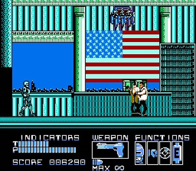Sendo este um jogo de origem arcade, é de esperar um grau de dificuldade algo elevado. E isso acontece porque para além de os inimigos surgirem de todos os lados e o Robocop não é propriamente a personagem mais ágil de sempre, os inimigos fazem respawn constante. Em baixo, à direita, temos uma barra de estado que nos apresenta várias informações. As barras T e P correspondem a Time e Power, a primeira vai-se esvaziando com o tempo, supostamente representando a carga das baterias do cyborg. A segunda esvazia-se sempre que sofremos dano. À medida que vamos jogando vamos encontrar diversos power ups como itens regenerativos (tanto de bateria como de armadura) ou outras armas que podemos vir a equipar. A arma que carregamos por defeito até tem uma boa taxa de fogo e possui munições infinitas, já as restantes possuem um número limitado de balas. À direita temos uma série de ícones que por vezes piscam. O primeiro, com a cara do Robocop, dá sinal sempre que estivermos perto de uma parede destrutível, que tanto pode representar um atalho, como acesso a alguns power ups como armas poderosas. O segundo, com a forma de um punho começa a piscar quando nos deparamos com algum inimigo ou obstáculo que apenas pode ser derrotado com os punhos. O terceiro é um radar que indica a presença de inimigos por perto e sinceramente é um bocado inútil pelas razões que já mencionei: os inimigos são bastante numerosos e com respawn infinito. O último alerta-nos para quando tivermos as baterias perto do fim, o que também é algo inútil pois temos essa indicação visual na barra de energia respectiva.